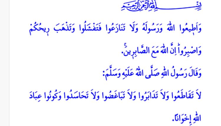 Okuduğum ayet-i kerimede Yüce Rabbimiz şöyle buyuruyor: “Allah’a ve Resûlüne itaat edin ve birbirinizle çekişmeyin. Sonra gevşersiniz ve gücünüz elden gider. Sabırlı olun. Çünkü Allah sabredenlerle beraberdir.”[1]