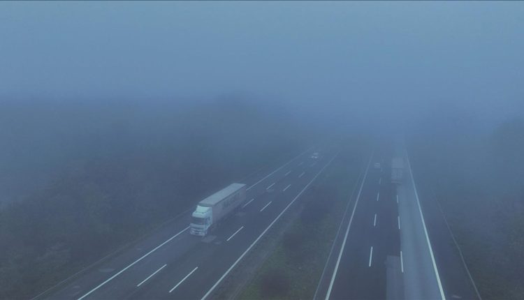 Sis tabakasının kapladığı ova ile sisin etkili olduğu otoyoldaki trafik akışı, havadan görüntülendi.
