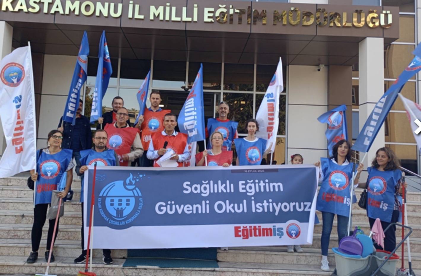 “Aydınlık yarınlarımızın güvencesi çocuklarımızın yetiştirildiği okullar tam anlamıyla kaderine terk edilmiş durumda” diyen Eğitim-İş Sendikası yetkilileri, “Yıllardır okulların temizlik ve güvenlik ihtiyaçlarının giderilmesi için işinin uzmanı insanların kadrolu biçimde istihdam edilmesi gerektiğinin altını çiziyoruz. Özellikle pandemi sürecinde okulların hijyenik olmasının önemi herkesçe kavranmış olmasına rağmen ve okullarımızda artan şiddet olayları koca bir tehlike olarak gözümüzün önünde büyürken Millî Eğitim Bakanlığı bu sorunlar karşısında bugüne dek bir çözüm iradesi göstermemiştir. Bugün ise sorunu daha da beter hale getirmeyi seçmiştir. 29 Ağustos 2024 tarihli Resmi Gazete’de yayımlanan İşgücü Programlarının Yürütülmesine İlişkin Usul ve Esaslar Hakkında Yönetmelik, kamu kurumlarında kalıcı istihdam yerine geçici ve düşük ücretli sömürünün önünü açmıştır. Bu yönetmeliğe göre haftanın 3 günü 8 bin 447 TL’ye çalıştırılacak kişilerle okulların ne güvenliği ne temizliği sağlanabilir, üstelik bu asla kabul edilemeyecek bir emek sömürüsüdür” dedi.