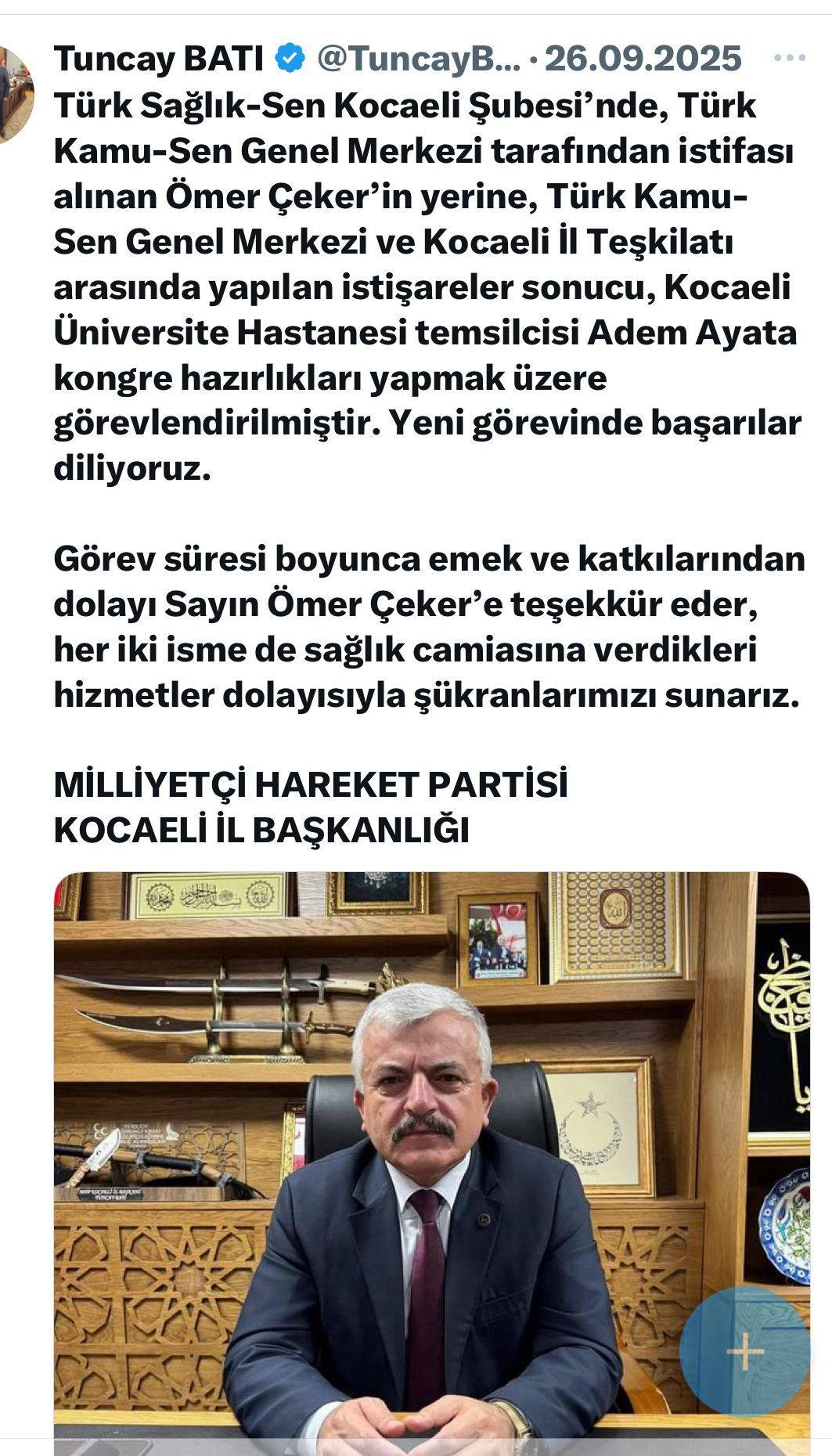 Çeker’in görevden alma ve yerine gelecek isim ile ilgili açıklamayı MHP Kocaeli İl Başkanlığı’nın yapması da yeni bir tartışmayı ateşledi. MHP İl Başkanı Tuncay Batı’ya ve İl Başkanlığı’na ait hesaplardan, “Teşkilatımızla istişare halinde alınan bu karar, sendikal hareketin birlik ve bütünlüğünü güçlendirecektir” ifadelerine yer verilmesi de şaşkınlık yarattı. Daha önce Kamu-Sen’de hizmet etmiş bazı isimler, BSHA’ya yaptıkları açıklamada, “Siyasetin sendikal yönetimine bu kadar müdahale etmesi kabul edilemez. Seçilmiş başkanlar ancak seçimle gidebilir. Delegelerin en çok oyunu alan kişi başkan seçilir. Bu Cumhuriyetimizin ve Demekrasimizin en önemli unsurlarından biridir. Herkesin buna saygı duyması gerekir” dedi (BSHA-Bilim ve Sağlık Haber Ajansı)