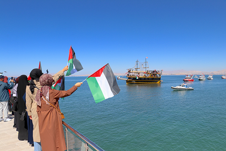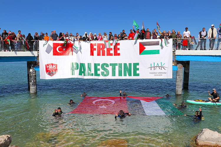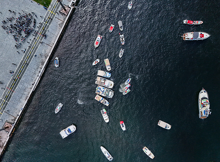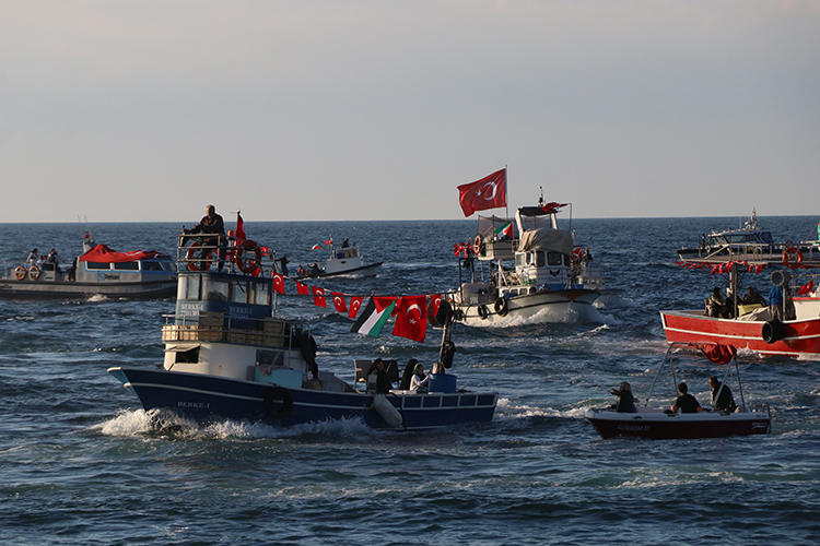 Konuşma ve duaların ardından teknelere binerek denize açılan vatandaşlar, Filistin’e destek sloganları attı.