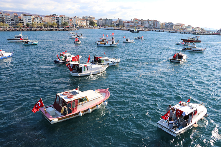Edirne Valiliğince Enez Limanı’nda düzenlenen etkinlik kapsamında limandaki tekneler Türk ve Filistin bayraklarıyla donatıldı.