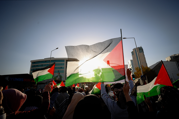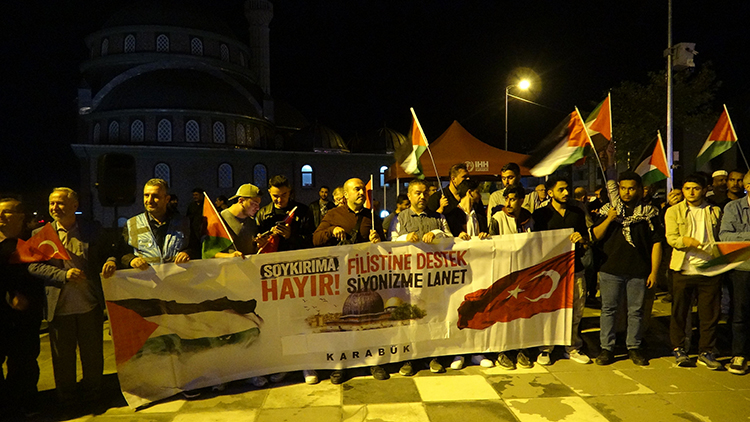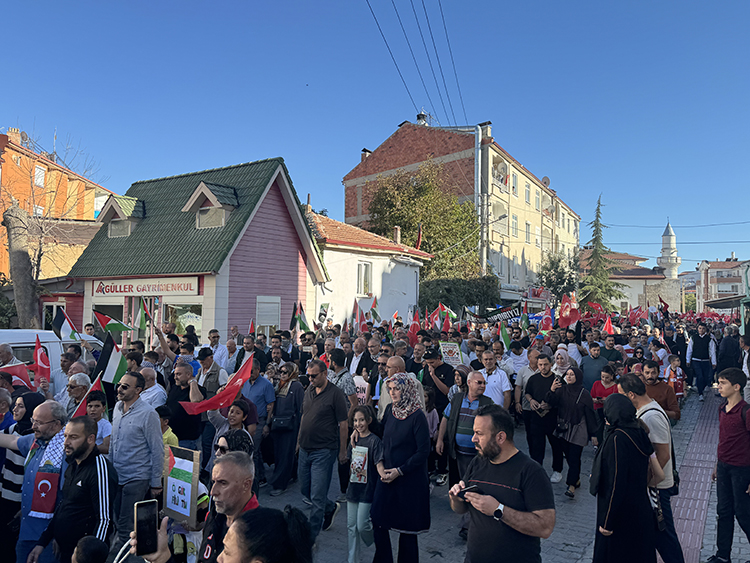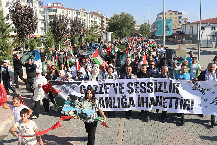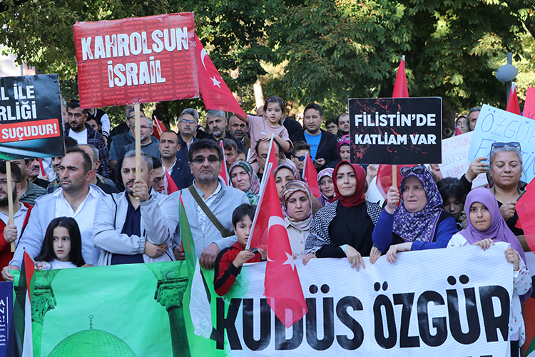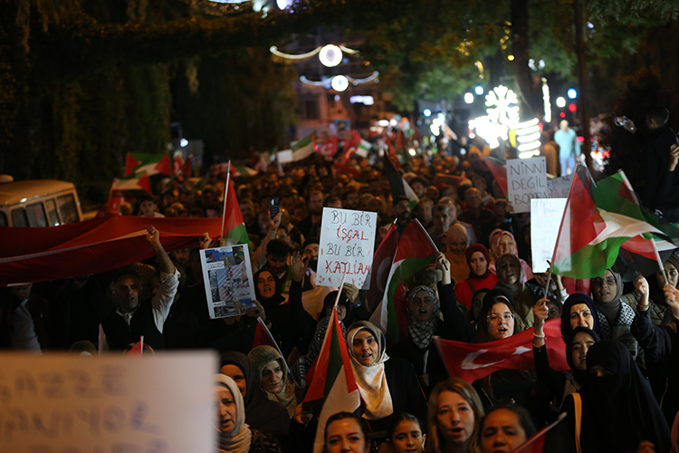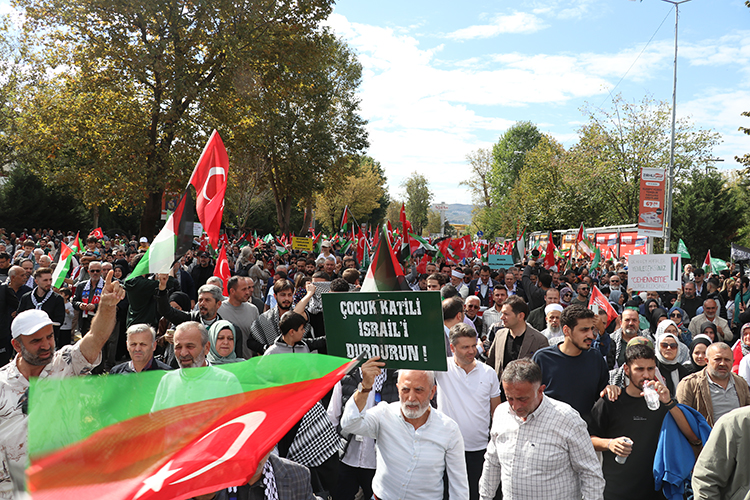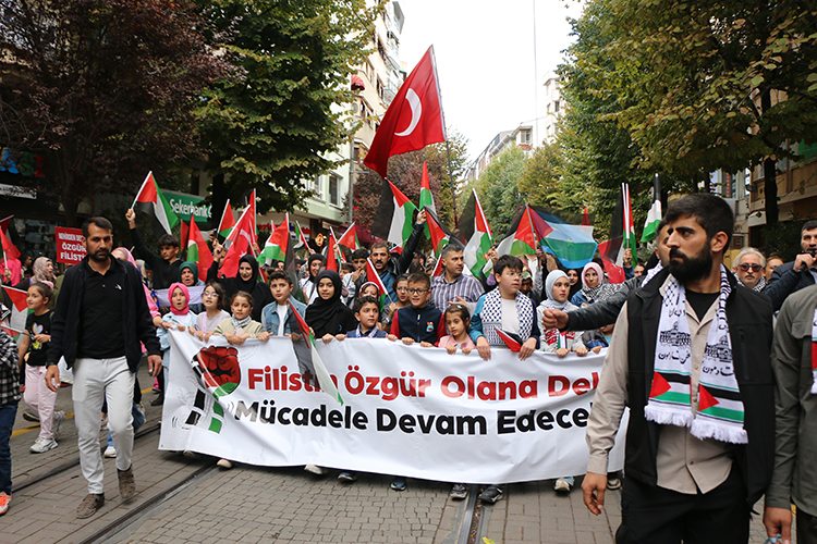 Türk ve Filistin bayraklarıyla İsrail aleyhine sloganlar atan kalabalık, “Şehitlerimiz ve Filistin için yürüyoruz”, “Bir adım ötede insanlık ölüyor, kahrolsun İsrail”, “Müslümanlar birleşin”, Filistin özgür olana kadar mücadelemiz devam edecek”, “Bir sabah gelecek kardan aydınlık” yazılı pankartlar taşıdı.