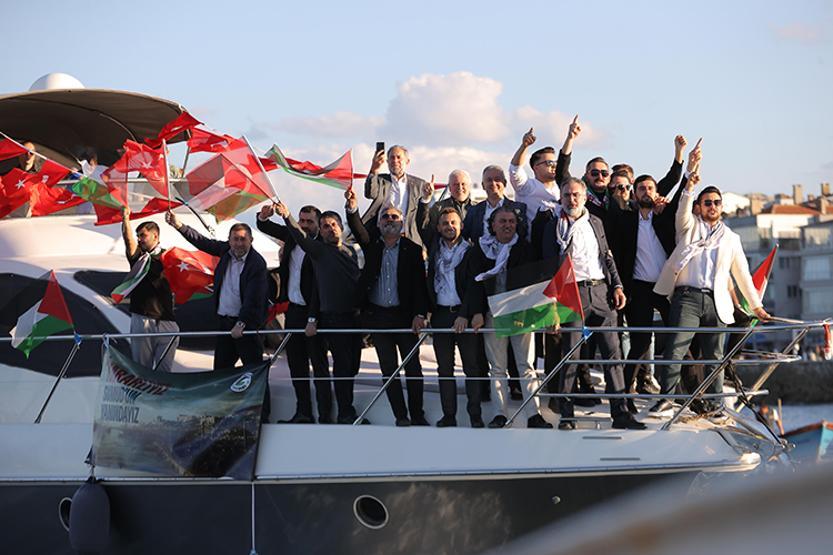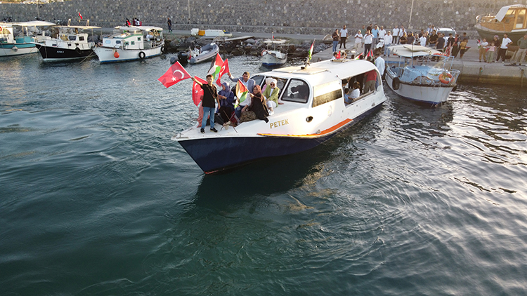 Konuşmaların ardından dua edildi, Türk ve Filistin bayraklarıyla donatılan tekneler denize açıldı.