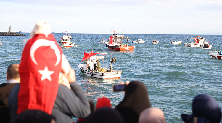 Sahil Güvenlik Komutanlığı ekiplerinin de eşlik ettiği balıkçı tekneleri, Özgecan Aslan Meydanı’nda ulaştı.