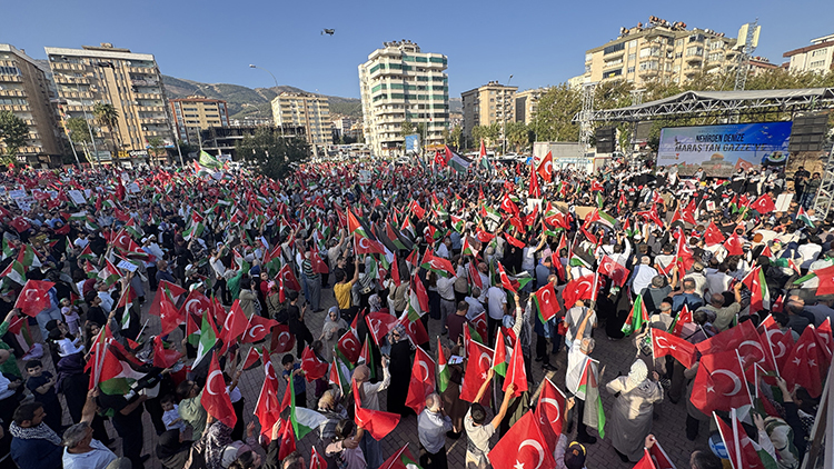 Ellerinde Türk ve Filistin bayrakları ile Gazze’de yaşanan dramın fotoğraflarının yer aldığı pankartlarla meydanı dolduranlar, “Sumud’a selam, direnişe devam”, “siyonist İsrail, işbirlikçi Amerika”, “özgür Filistin, katil İsrail”, “Çocuklar uyurken susulur, ölürken değil”, “Tam bağımsız Filistin için yürü” sloganları attı.