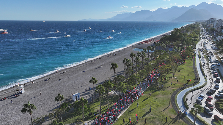 Etkinlik kapsamında Kaleiçi Yat Limanı ve Sarısu balıkçı barınaklarından hareket eden bazı tekneler de Konyaaltı Plajı açıklarında buluştu. Türk ve Filistin bayrakları asılan ve üstünde “Free Palestine” pankartı bulunan tekneler denizde kortej oluşturdu.