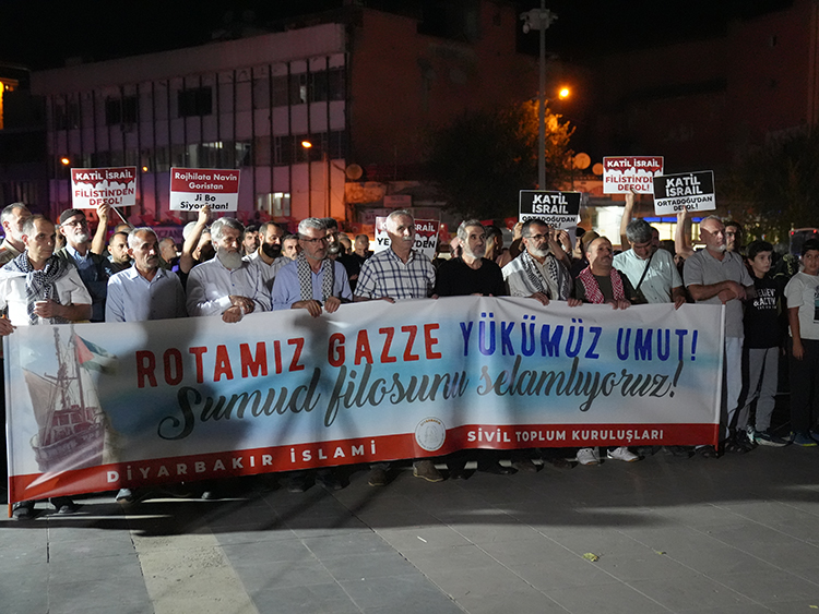 Tekbirler getiren ve İsrail karşıtı sloganlar atan grup, “Nehirden denize özgür Filistin” ve “Rotamız Gazze yükümüz umut”, “Sumud Filosu’nu selamlıyoruz” yazılı pankartlar açtı.