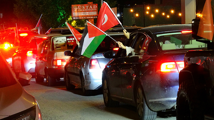 Grup üyeleri, burada Filistin ve Türk bayraklarıyla süsledikleri araçlarıyla konvoy oluşturarak şehir içinde tur attı.