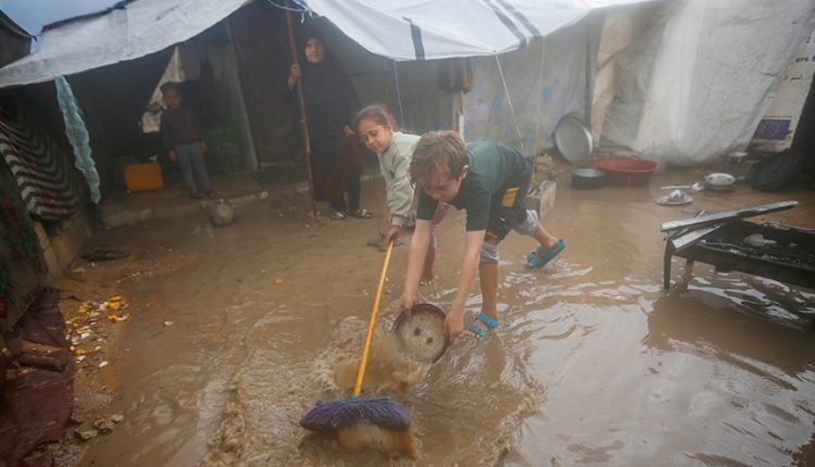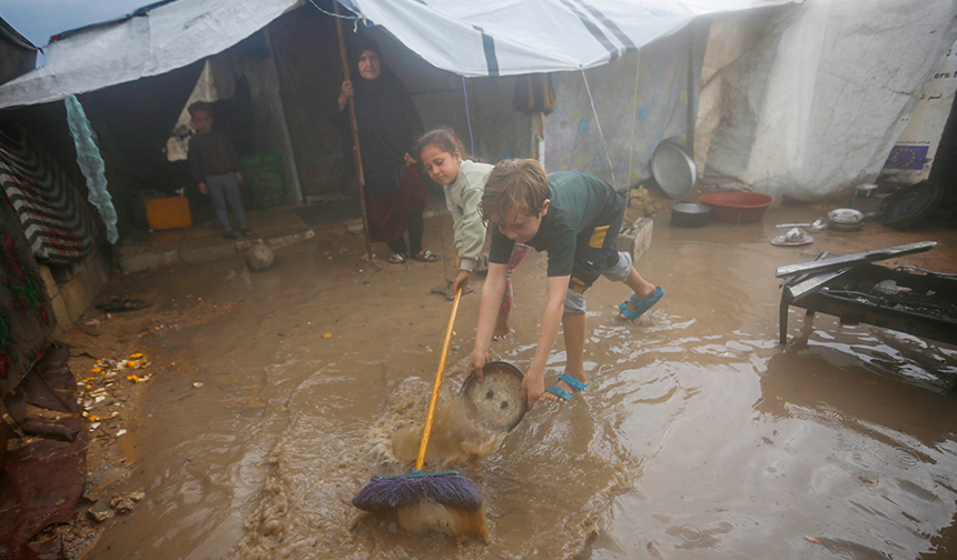 Yağış sonrası su ve çamur birikintilerinin oluştuğu bölgede, İsrail’in saldırıları nedeniyle evleri yıkılan Filistinliler kötü hava koşullarıyla da mücadele ediyor.