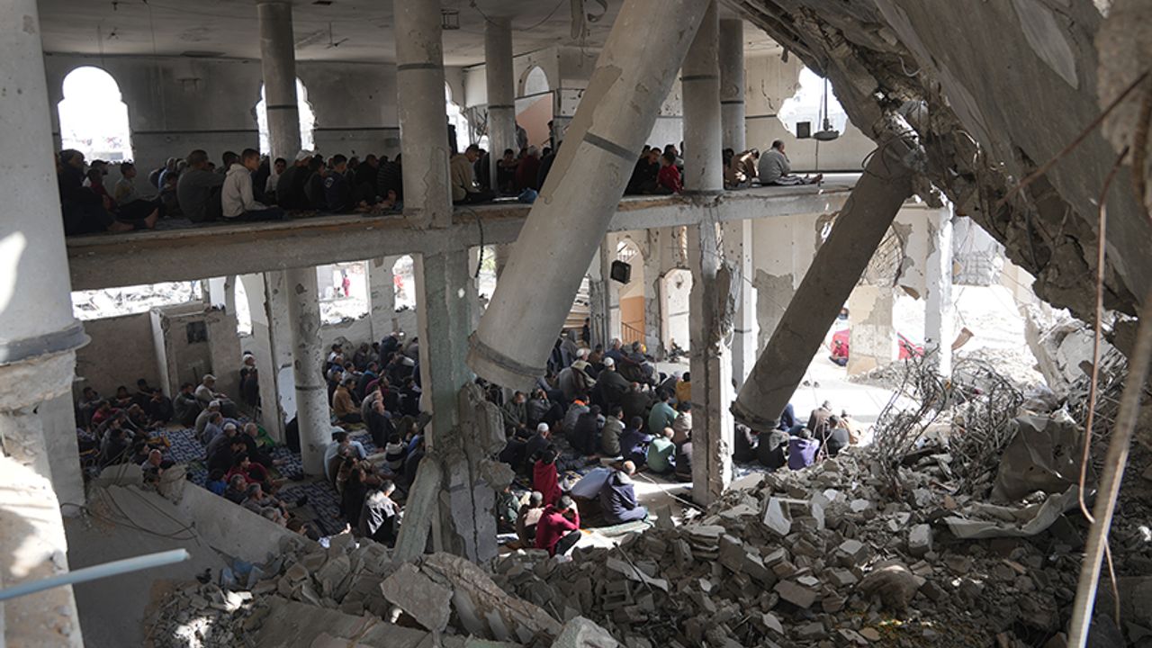 Gazze Şeridi’nin Zeytun Mahallesi’nde yaşayan Filistinliler, cuma namazını işgalci İsrail saldırılarında yıkıma uğrayan Salahuddin Camii enkazında kıldı.