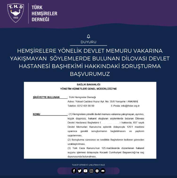 Türkiye Hemşireler Derneği (THD), hakkında mobbing iddiaları bulunan Dilovası Başhekimi Op.Dr. Ömer Naci Yılmaz hakkında soruşturma başlatılması için Kocaeli Cumhuriyet Başsavcılığına suç duyurusunda bulundu. THD, başvuru dilekçesinde, Başhekim Yılmaz’ın 657 Sayılı Devlet Memurları Kanununa Aykırılık dolayısıyla 125/1 Maddesi uyarınca gerekli soruşturmanın başlatılmasını ve yaptırım uygulanmasını talep etti. Başvuru Dilekçesinde soruşturma süresince Başhekim Yılmaz’ın tedbiren görevinden uzaklaştırılması yönünde taleplerini ileten THD Başkanlığı, “TCK 125. Maddesince düzenlenen hakaret suçunu işlemesi dolayısıyla Kocaeli Cumhuriyet Başsavcılığına suç duyurusunda bulunulmuştur” bilgisini kamuoyuyla paylaştı.