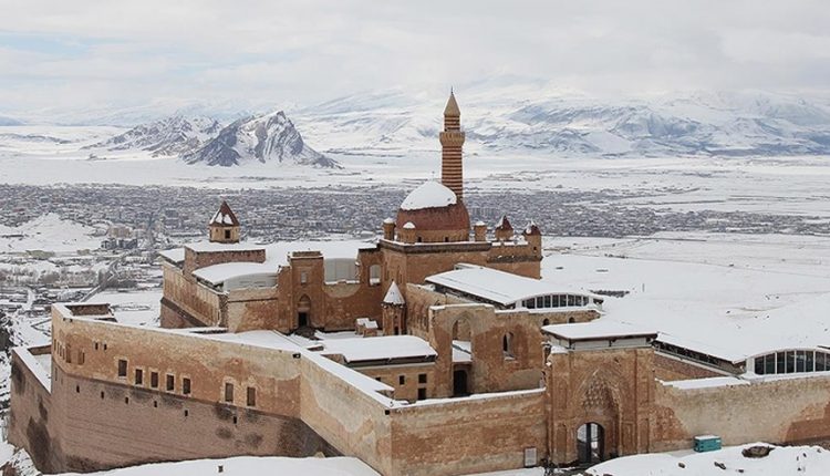 İshak Paşa Sarayı ilkbaharda karlı manzarasıyla ziyaretçilerini ağırlıyor