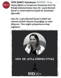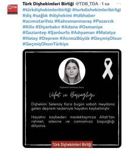 Kahramanmaraş merkezli depremde sağlık camiasından hayatını kaybedenlerin sayısı artıyor. Genç Dişhekimi Selenay Kara depremde göçük altında kalarak hayatını kaybetti. Türkiye Diş Hekimleri Birliği (TDB), Gaziantep’te yeni mezun Diş Hekimi Kara’nın vefatı üzerine ailesine ve tüm sağlık camiasına başsağlığı diledi.Kara’ya arama kurtarma ekiplerinin ulaştığı ancak vefat ettiği öğrenildi. Bir acı haber de Hatay’dan geldi. Hatay Eğitim Araştırma Hastanesi Acil Tıp Kliniği’nde görev yapan Uzman Dr. Leyla Sürmeli’nin depremde hayatını kaybettiği öğrenildi. Türkiye Acil Tıp Derneği (TATD) doktorun ailesine ve sağlık çalışanlarına başsağlığı diledi. (BSHA-Bilim Ve Sağlık Haber Ajansı)