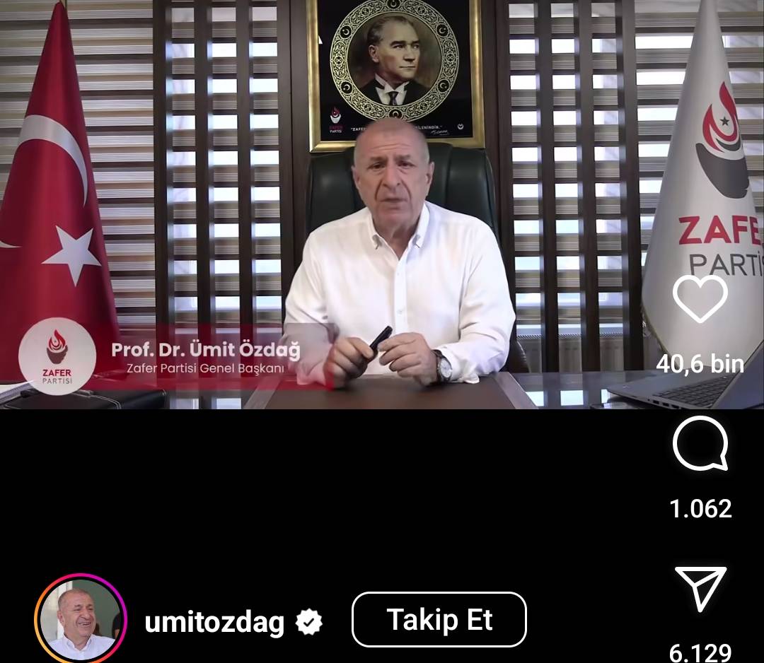 Özdağ instagramda yayımladığı açıklamada, “Ülkemize yönelik stratejik göç mühendisliğini, adeta düzenlenmiş kavimler göçünü engellemeye yönelik mücadele Türk kamuoyunda dikkatle izlendi ve büyük takdir toplandı. Zafer Partisi’ne oy versin, vermesin, AK Parti’ye, Milliyetçi Hareket Partisi’ne, Cumhuriyet Halk Partisi’ne, İYİ Parti’ye, Saadet Partisi’ne ve diğer partilere oy veren değerli seçmenlerimiz Zafer Partisi’nin sığınmacı ve kaçakların vatanlarına yollanması konusundaki görüşünü güçlü bir şekilde desteklediler. Bütün saldırılara rağmen, bütün iftiralara, yalanlara, tehditlere, tutuklama girişimlerine ve tutuklamalara rağmen Zafer Partililer hiç taviz vermeden bugüne kadar mücadelelerini hukukun içinde kaldı. Suriye ile görüşme için bazı adımlar atılmaya başladı ve bu çerçevede birkaç gün önce Erdoğan bir açıklama yaparak yıllardan beri şeytanlaştırdığı, yıllardan beri şeytanlaştırdığı, Suriye Cumhurbaşkanı Beşer Esad’la eski günlerde olduğu gibi görüşebileceğini ifade etti. Ama daha önemlisi Suriye’nin kuzeyinde Türkiye, Rusya ve Suriye arasında yapılan görüşmeler neticesinde doğrudan ticari ilişkilerin de yürümesini sağlayacak Türkiye ile Suriye arasında bir kapı açıldı. Ve yine Zafer Partisi’nin vermiş olduğu mücadele sivil toplum alanına da sıçradı. Sığınmacı yükü altına ezilen Gaziantep’te önce 41 sivil toplum örgütü yeter artık Gaziantep bu yükü taşıyamıyor şeklinde bir rapor ortaya koydu. Gaziantep Sanayi ve Ticaret Ulusu Başkanları ayrı ayrı yeter artık dediler” dedi.