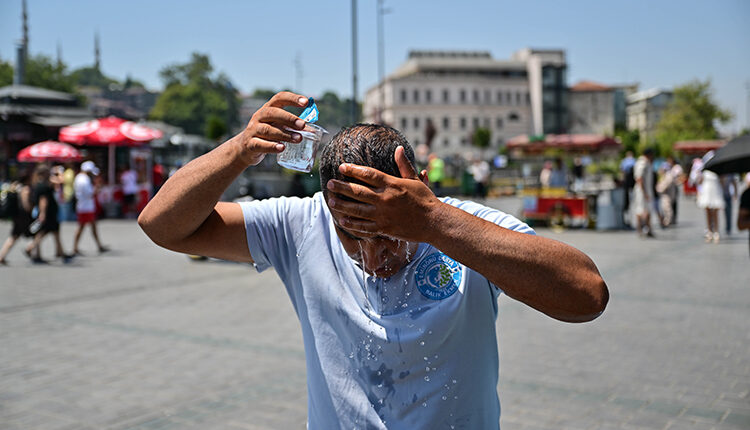 Sıcağa rağmen dışarı çıkmak zorunda kalan bazı vatandaşlar şemsiye taşıyor, bazıları da pet şişelerdeki suyu başlarına dökerek serinlemeye çalışıyor.